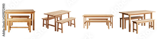 Assortment of contemporary minimal and natural wooden dining room furniture including tables benches and sets for home and kitchen interior design
