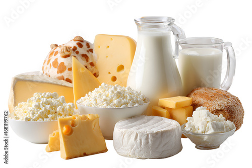 Assortment of dairy products including cheese milk and yogurt isolated on transparent background