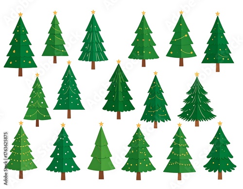 Assortment of festive, green Christmas trees with varying decorations, some with star toppers and lights. Isolated on white