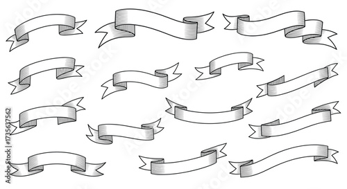 Assortment of fifteen black and white ribbon banners with textured hatching and pointed ends on a white background