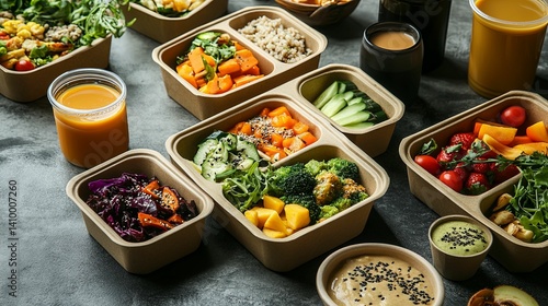 meal, container, healthy, lunch, dinner, vegetable, fruit, juice, salad, rice, broccoli, carrot, cucumber, tomatoes, strawberry, mango, peach, protein, colourful, balanced, dietary, nourishment, organic, sustainable, food, portion, serving, dish, bowl, dipping, sauce, sprout, vegan