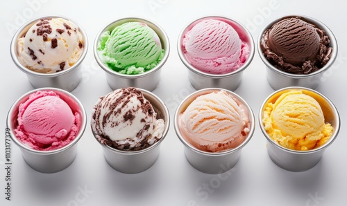 ice cream, scoop, assortment, metal, cup, dessert, sweet, cold, treat, glacé, creamy, delicious, refreshing, summer, snack, food, dairy, vanilla, chocolate, strawberry, mint, yellow, favor, colourful, tasty, white, background, isolated, closeup, topview, overhead, epicure, fresh, smooth, rich, classic, traditional, fun, enjoy, happy, party, celebration, indulge