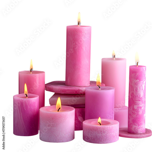 Assortment of pink pillar candles with glowing flames isolated on a transparent background