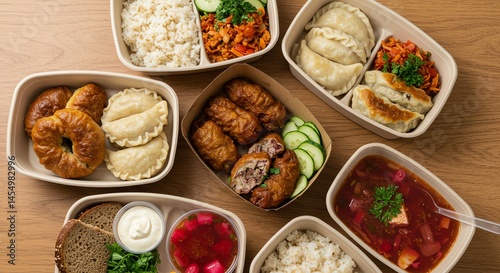 food, eat, healthy, bright, indoor, lunch, pastry, soup, cucumber, rice, fried, baked, cooked, served, wooden table, still life, studio, natural light, casual attire, warm, inviting, eatery, cafes, take-out, container, meal, snack, dinner, breakfast, cookery, dish, ingredient, serving