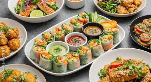 Assortment of various asian dishes including spring rolls and salads on a table.