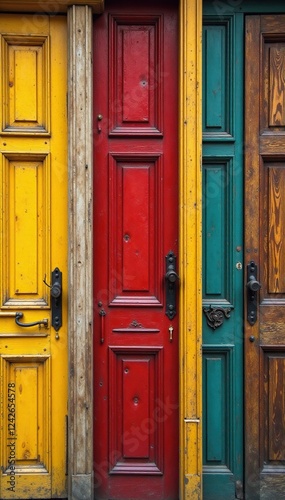 Assortment of wooden doors, diverse textures & colors, clean background, variety, craft