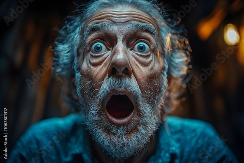 excitement, astonished, elderly, man, eye, dramatic, surprise, expressive, portrait, shock, emotion, intense, lighting, wrinkle, beard, senior, reaction, amazement, face, grey, hair, casual attire, shirt, human, male, unexpected, high-coloured, closeup, thoughtful, mature, bright, attention, presence, isolated, individual, moment, glance, depth, dynamic, cinematic, visual, engaging, focused, piercing, storytelling, mood