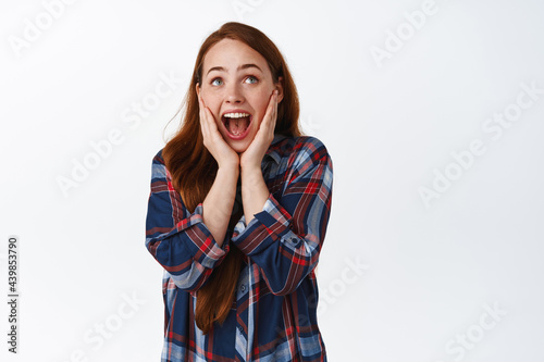 Astonished ginger girl screams from amazement and joy, looking at something awesome, look up and shouting happy, watching tv, standing over white background