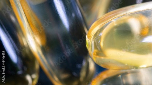 Astonishing closeup of Omega 3 capsules (pills), stacked together in a pile. Medical journals and life sciences concept.