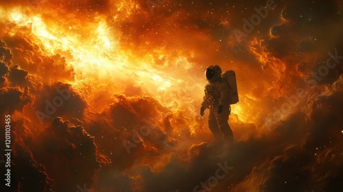 Astronaut exploring fiery nebula, cosmic clouds background; space exploration, science fiction art