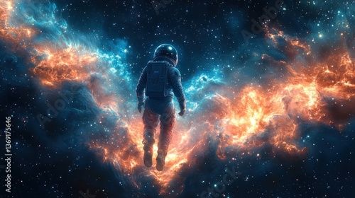 Astronaut floats amidst vibrant nebulae in cosmic expanse