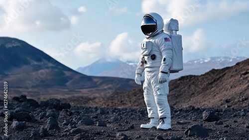 Astronaut in spacesuit stands on rocky terrain with mountains and blue sky background