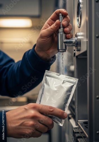 astronaut, food, spaceship, futuristic, technology, galley, science fiction, hydratation, survival, man, anonymous, hand, closeup, pouch, dispenser, hot water, nozzle, metallic, routine, nourishment, innovation, space-travel, mission, interior, kitchen, background, cinematic, photorealistic
