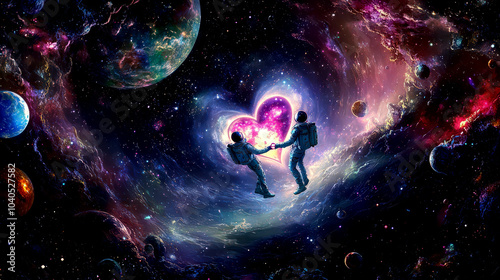 Astronauts in love: cosmic romance with heart-shaped nebula in space. Happy Valentine's day. Cute romantic card.