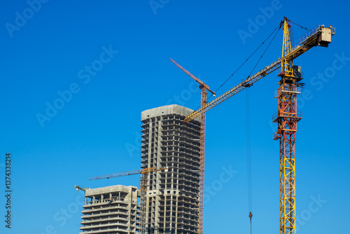 At a construction site, there is a bright blue sky in the background