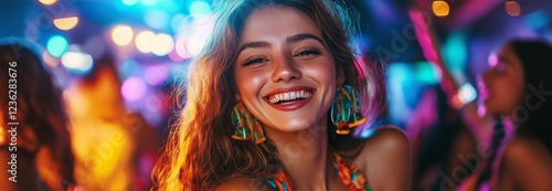 At a nightclub, a joyful Hispanic girl wearing vibrant clothing is dancing to music while dancing in neon lights.