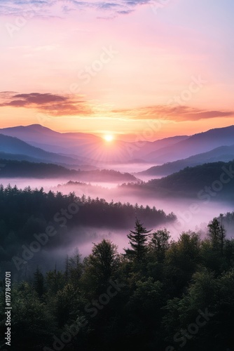 At dawn, a stunning sunrise brightens misty mountains and lush forests in pastel hues, creating an enchanting landscape that captivates all who witness it, instilling calm and tranquility