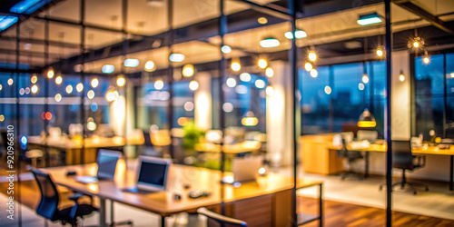 At night beautiful Abstract blurred office interior room. blurry working space with defocused effect