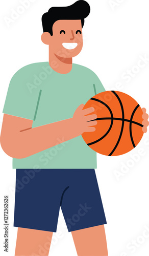 Athletic man smiling while holding a basketball in minimal vector illustration