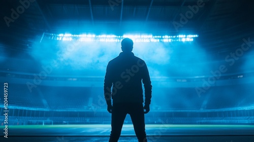 Athletic man standing in a middle of a stadium, blue ambient lighting, camera placed behind his back
