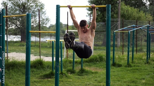 Athletic man trains abdominal muscles raising legs on horizontal bar at sports ground. Young sportsman exercising on pull-up bar outdoor. Sporty athlete working out at nature. Healthy lifestyle