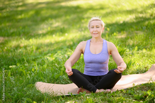 Athletic middle-aged woman doing yoga outdoors in the park in the lotus position with her eyes closed.Meditation concept