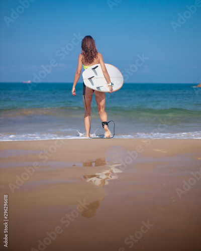 Athletic woman surfer, holding her surfboard under her arm and walking towards the sea. Breakewater in the far background.