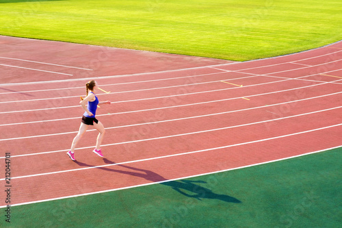 Athletic young woman in pink sneakers run on running track stadium
