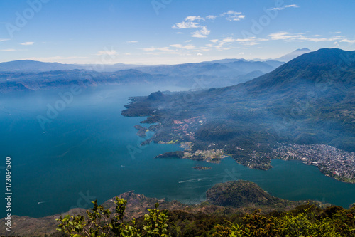 Atitlan lake in Guatemala, picture taken from San Pedro volcano. Volcanoes Cerro de Oro and Toliman, Atitlan at the right side, village Santiago Atitlan.