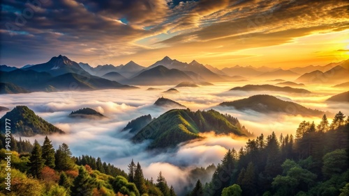 Atmospheric Mountain Panorama: Panoramic, sweeping vista, mountains in mist or fog, soft lighting