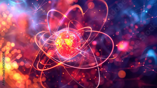 atom, atomic, nucleus, electron, energy, physics, science, quantum, illustration, concept, generating, power, nuclear, particle, proton, neutron, model, structure, scientific, research, education, chemistry, micro, macro, abstract, background, light, glow, bright, colours, red, orange, purple, blue, vibrant, dynamic, motion, blur, bokeh, futuristic, technology, innovation, discovery, exploration, universe, space, matter, element