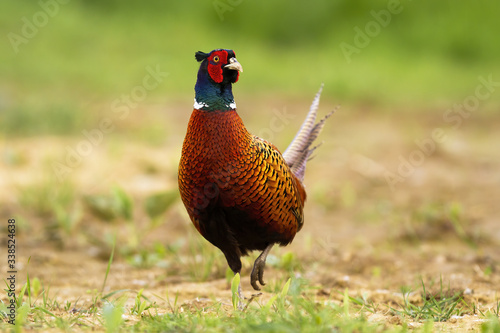 moving, europa, cock, coloration, horizontal, green, looking, season, step, alert, copy space, attentive, full body, pheasant, watching, environment, scared, solitary, standing, outdoors, bird, walking, nature, animal, grazing, field, game bird, observing, spring, wild, grass, wildlife, colourful, feather, springtime, plumage, wilderness, brown, meadow, beak, avian, fauna, male, red, blue, orange, wing