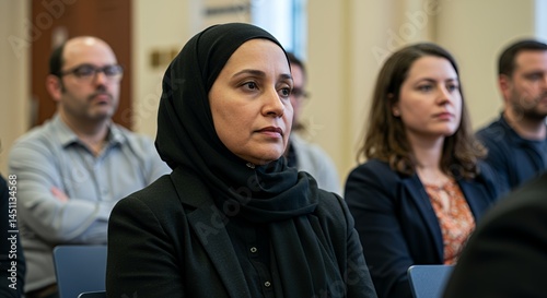 woman, meeting, conference, attentive, serious, focused, hearer, audience, professional, business, indoor, people, group, gathering, woman, female, person, portrait, head shot, closeup, face, expression, seriousness, concentration, thoughtful, considerate, respectful, dignified, composed, calm, peaceful, quiet, still, seated, present, participant, assembly