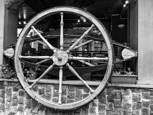 Attractions and entertainment in the Mtatsminda park on the funicular. Wooden cartwheel in the cafe on the wall