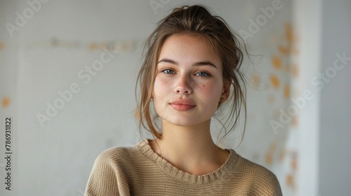 Attractive 20 yo blond woman with beautiful skin standing against a receding wall.