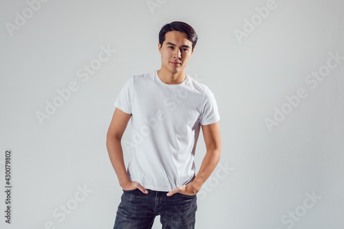 casual attire, guy, t-shirt, studio, 1, blank, male, attractive, photogenic, portrait, young, asian, white, shirt, person, design, background, man, print, adult, boy, advertisement, top, beauty, body, clothes, cotton, fashion, jean, lifestyle, smart, youth, head, face, free, looking, space, closeup, apparel, model, eye, empty, muscle, close, active, human, front