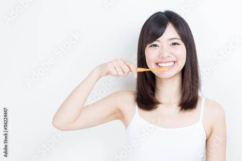 woman, people, toothbrush, dental, dentist, teeth, cosmetic, health, cleanliness, healthy, smile, alone, camisole, young, appealing, beauty, japanese, asian, white, cut-out, background
