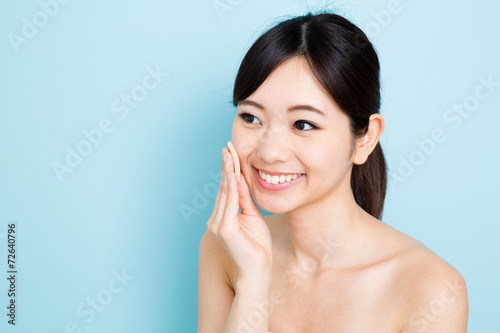skincare, foundation, puff, woman, people, smile, alone, beauty, cosmetic, health, beauty, cheek, glossy, bare skin, make-up, care, skin, skin, cosmetic, appealing, young, chroma key, blue, waist up, japanese, asian, cut-out, background, copy space
