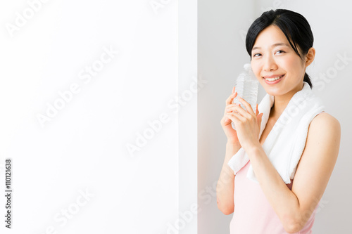 woman, people, alone, smile, water, plastic bottle, chill, relax, rest, break, towel, exercise, cosmetic, health, diet, beauty, gym, camisole, beauty, young, window, japanese, asian, chinese