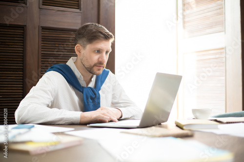 Attractive businessman sitting at cafe table amidst various papers and browsing laptop.