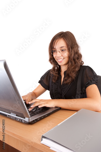 20s, adult, alone, background, beautiful, black, brown, business, businesswoman, caucasian, cheerful, clothing, collar, computer, corporate, desk, employment, female, happy, indoor, isolated, job, laptop, modern, notebook, office, only, people, person, portrait, professional, shirt, single, sitting, smart, smile, smiling, studio, table, technology, typing, using, white, wireless, woman, work, men at work, working, workplace, young