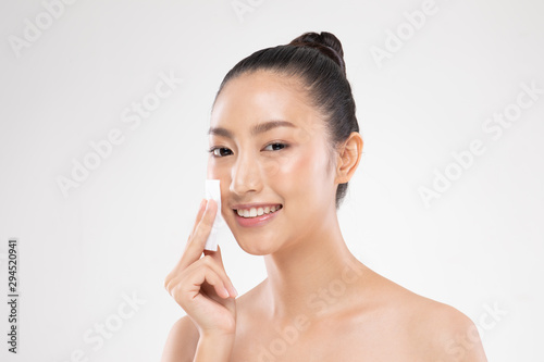 Attractive Charming Asian young woman smile and using tissue with toner for cleaning make up feeling so fresh and clean with healthy skin,isolated on white background,Beauty Cosmetics Concept