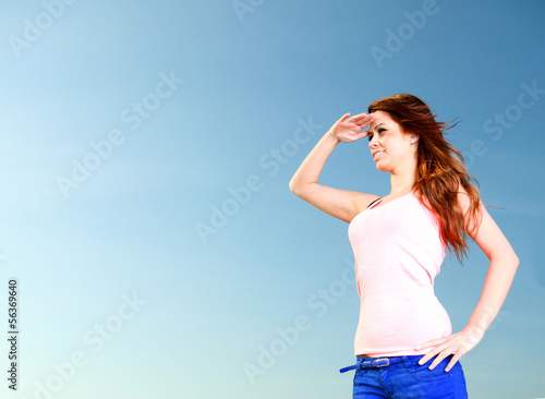 adult, arms raised, attractive, beautiful, beauty, blue, brown hair, caucasian, close, color image, day, european, female, girl, hand, holiday, horizon, leisure, long hair, look, nature, 1, peace, people, person, quiet, recreation, relax, relaxation, scenic, smile, summer, sun, sunlight, white, woman, young
