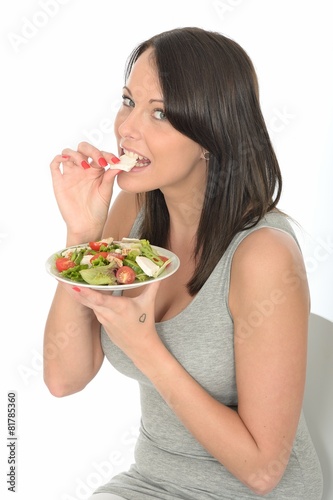 attractive, young, woman, dark hair, caucasian, 20s, isolated, white, background, clipping path, cut-out, adult, alone, posing, stock photograph, healthy, lifestyle, female, model, pretty, cute, wearing, grey, holding, plate, chicken, mixed, salad, weight, calorie, control, diet, dieting, meal, food, lunch, snack, happy, relaxed, eating