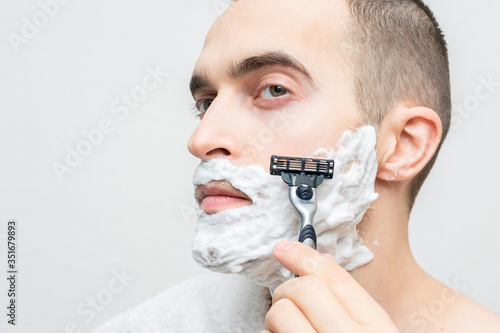 Attractive man shaves on camera with shaving foam, white background, copy space