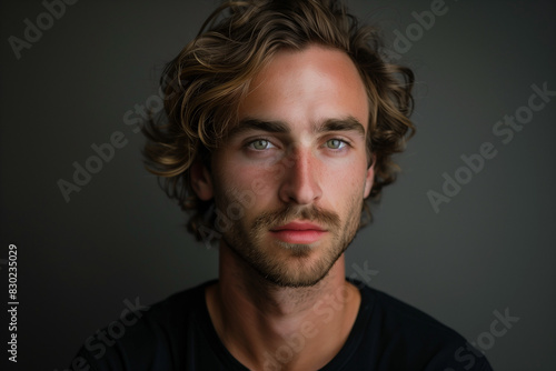Attractive Man with Light Brown Wavy Hair: Studio Headshot of Male Model in Black T-Shirt