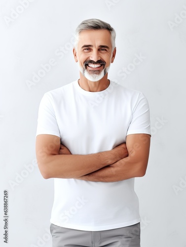 modern, mature, man, senior, attractive, grey hair, beard, stylish, fashionable, casual attire, trendy, happy, smile, contemporary, hip, cool, sophisticated, elegant, suave, dapper, well-groomed, polished, chic, smart, refined, cultured, photogenic, confident, charismatic, composed, poised, background, copy space, generative, ai