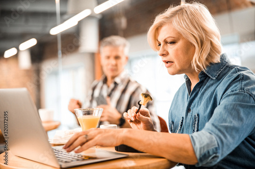 adult, attractive, business, tied-up, caucasian, hot drink, lunch, laptop, lifestyle, look, mature, snack, man, indoor, juice, cafes, beautiful, computer, cup, digital, drink, female, contraption, happy, hot, lady, people, person, screen, senior, to sit, technology, woman, work, workplace, cropped