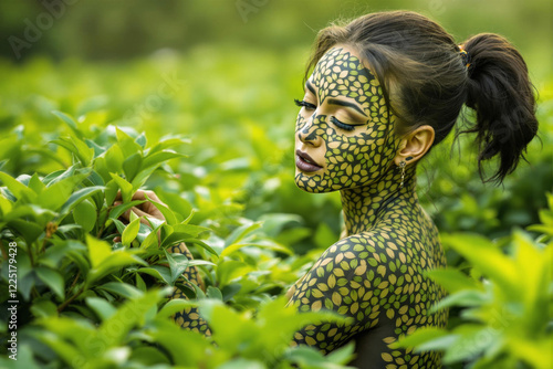 Attractive sexy woman in tea plantation setting. Body painting with tea leaves patterns. Promotion of natural food concept.