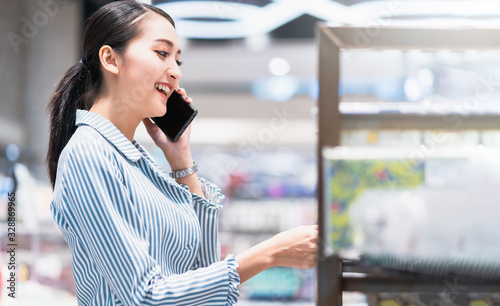 attractive smart beautiful asian female well dress communication smartphone with cheerful and confident blur public space background